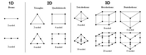 可以看到每种单元又可以提高形函数的阶数(控制点 node 数量)来提高精度。很多有限元研究也集中在这个领域。比如研究新的单元引用于结构动力反应以减小数值震荡,比如用3-D单元去模拟梁单元等等。其实理论上来说这个领域可以有无限可能,因为对精度和数值稳定的追求可以是无限的。