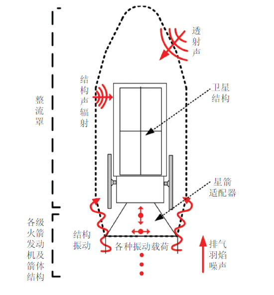 声振耦合是航天器尤其是载人航天器研究的重点,研究声振耦合实际上是研究航天器结构与声的交互作用,在模拟航天器声振耦合场时主要针对的是两个过程中的声振交互作用,一是发射过程中航天器在整流罩内时,运载支架振动载荷和气动噪声载荷的交互作用;二是航天器进入在轨飞行时密封舱内的振动和噪声相互作用。